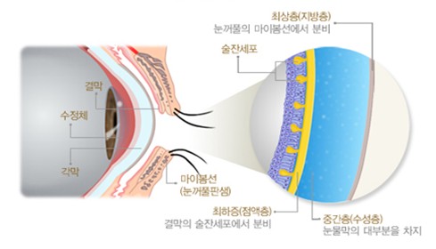 - 각막과 결막을 촉촉하고 부드럽게 해 주어 눈꺼풀과의 마찰을 줄여줌