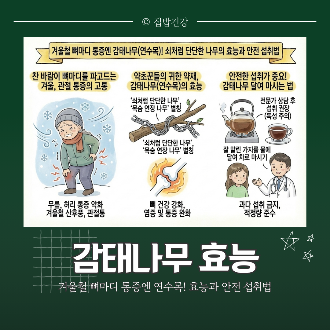 뼈 마디가 시린 계절, 자연이 준 선물인 연수목 차 한 잔으로 굳어있는 몸을 깨우고 관절 건강을 지켜보시길 바랍니다. 꾸준한 섭취를 통해 감태나무 효능을 지혜롭게 활용해 보세요.