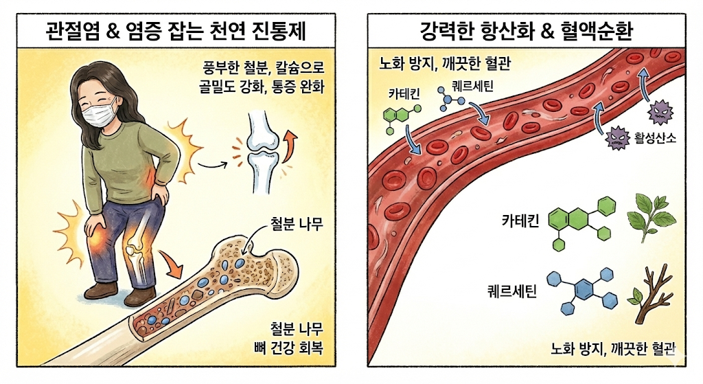 감태나무 효능의 핵심은 풍부한 미네랄과 카테킨 성분에 있습니다. 이 나무는 다른 식물에 비해 철분 함량이 월등히 높아 철분 나무라고 불립니다. 풍부한 철분과 칼슘은 골밀도를 높여 골다공증 예방에 기여하며, 손상된 뼈와 관절의 회복을 돕습니다. 또한, 정유 성분인 시네올은 체내 염증 매개 물질을 억제하여 관절염으로 인한 통증과 부종을 완화하는데 탁월한 작용을 합니다.