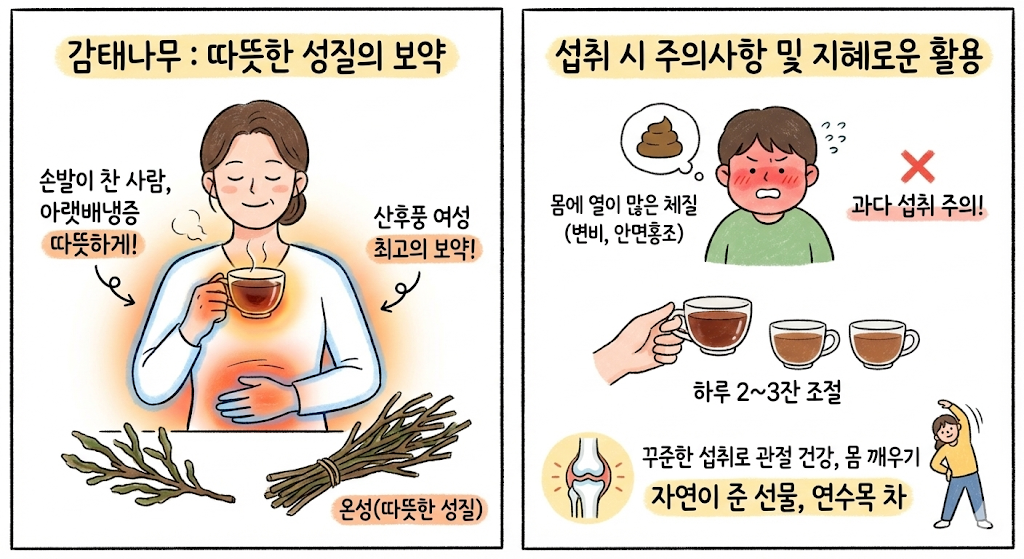 감태나무는 기본적으로 따뜻한 성질(온성)을 가지고 있습니다. 따라서 평소 손발이 차거나 아랫배가 냉한 사람, 산후풍으로 고생하는 여성에게는 최고의 보약이 됩니다. 하지만 부작용 없이 감태나무 효능을 보기 위해서는 주의할 점도 있습니다. 몸에 열이 많아 얼굴이 자주 붉어지거나 변비가 심한 체질인 경우 과다 섭취를 피하고, 하루 2~3잔 정도로 조절하는 것이 좋습니다.
