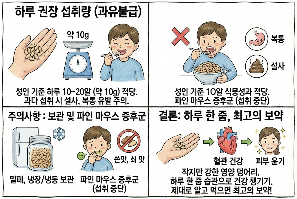 • 하루 권장 섭취량 : 성인 기준 하루 1-~20알(약 10g) 정도가 적당합니다.