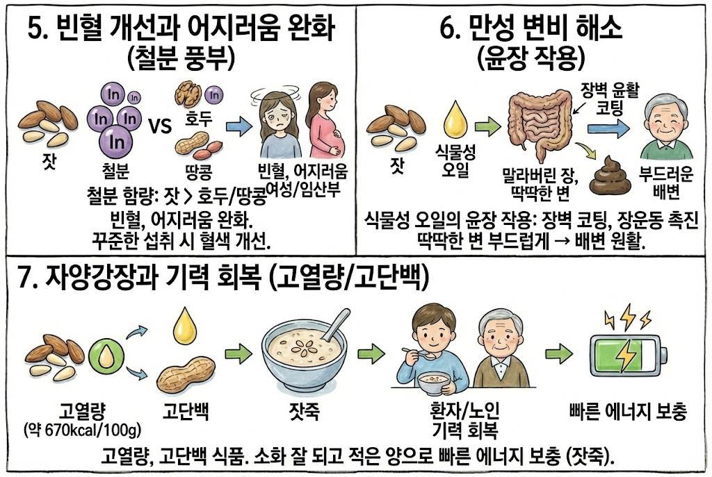 나이가 들면 장의 점액이 말라 변비가 생기기 쉽습니다. 잣의 풍부한 식물성 오일은 장벽을 부드럽게 코팅하고 장운동을 돕는 윤장작용을 합니다. 딱딱한 변을 부드럽게 만들어 배변을 원활하게 돕는 것이 대표적인 잣 효능 중 하나입니다.