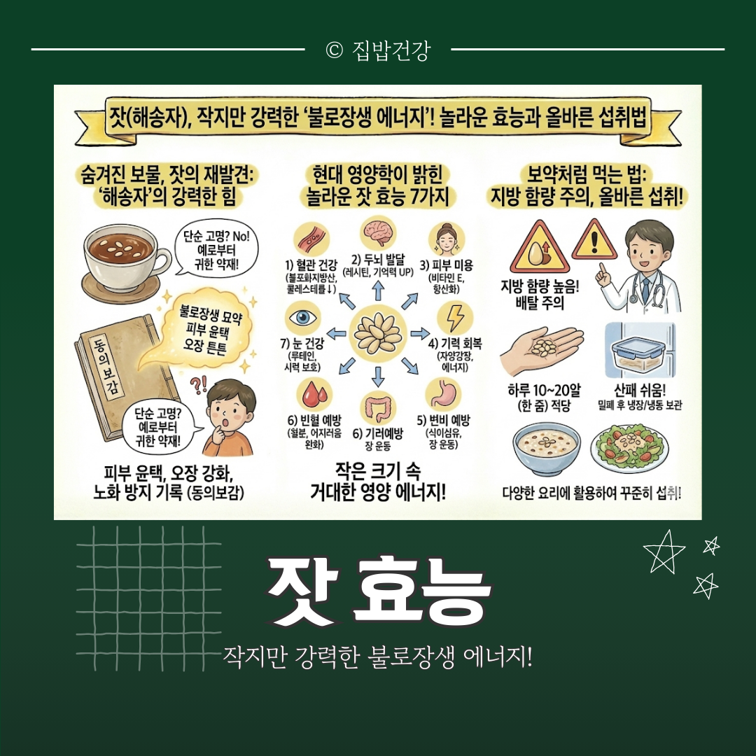 작지만 강한 영양 덩어리 잣, 하루 한 줌의 습관으로 혈관 건강의 피부 윤기를 모두 챙겨보시길 바랍니다. 제대로 알고 먹을 때, 잣은 최고의 보약이 됩니다.