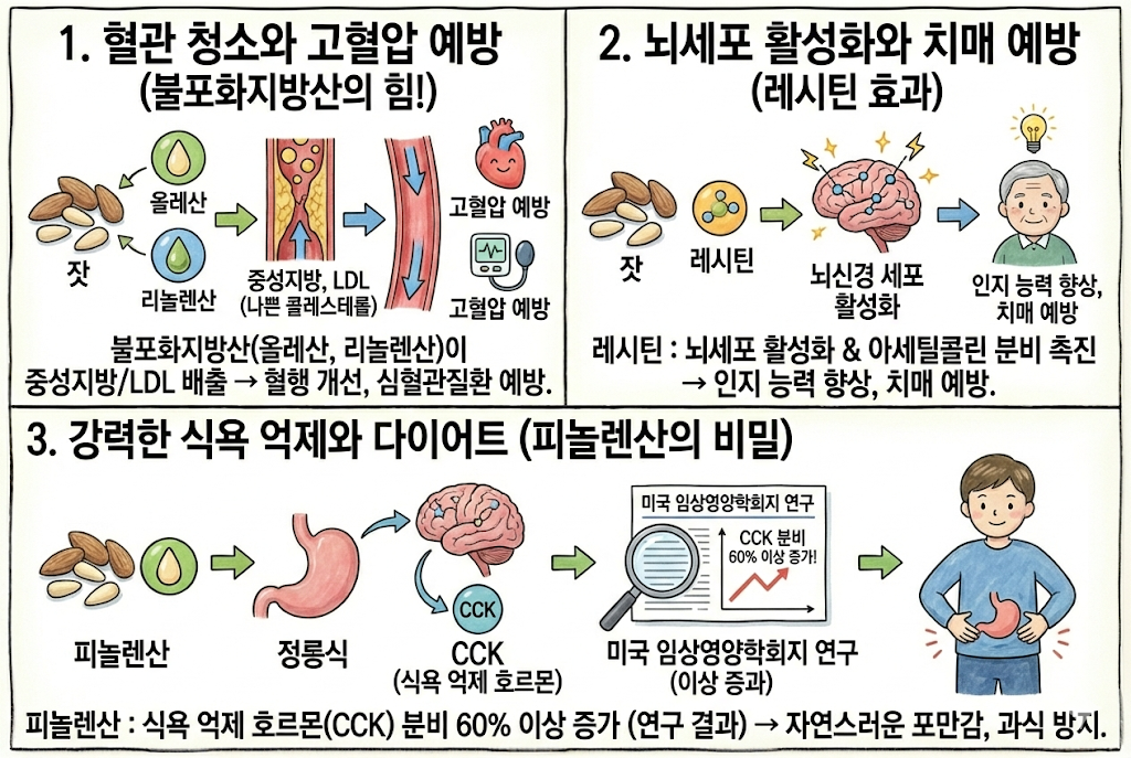 잣 효능의 핵심은 질 좋은 지방에 있습니다. 잣에 풍부한 올레산, 리놀렌산과 같은 불포화지방산은 혈관 속에 쌓인 중성지방과 나쁜 콜레스테롤(LDL)을 녹여 배출합니다. 이는 혈행을 개선하고 고혈압 및 동맥경화와 같은 심혈관질환을 예방하는데 탁월합니다.