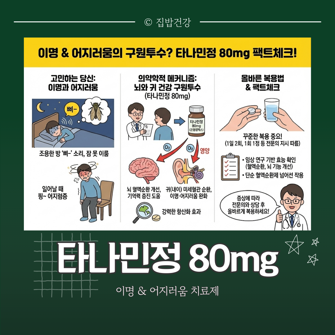 귀에서 나는 소리와 어지러움은 삶의 질을 떨어뜨리는 고통입니다. 단순한 노화 현상으로 방치하지 마시고, 검증된 의약품인 타나민정 80mg의 도움을 받아 맑은 정신과 평온한 일상을 되찾으시길 바랍니다.