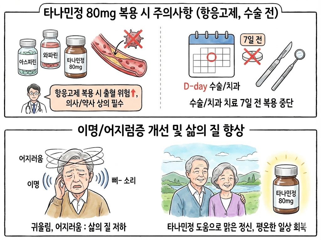 혈액을 묽게 하여 순환을 돕는 약리 작용 때문에 주의할 점이 있습니다. 아스피린이나 와파린 같은 항응고제를 이미 복용 중이라면 지혈이 잘 안 될 수 있으므로, 타나민정 80mg 복용 전 반드시 의사나 약사와 상의해야 합니다. 또한 수술이나 치과 치료 7일 전에는 복용을 중단하는 것이 안전합니다.