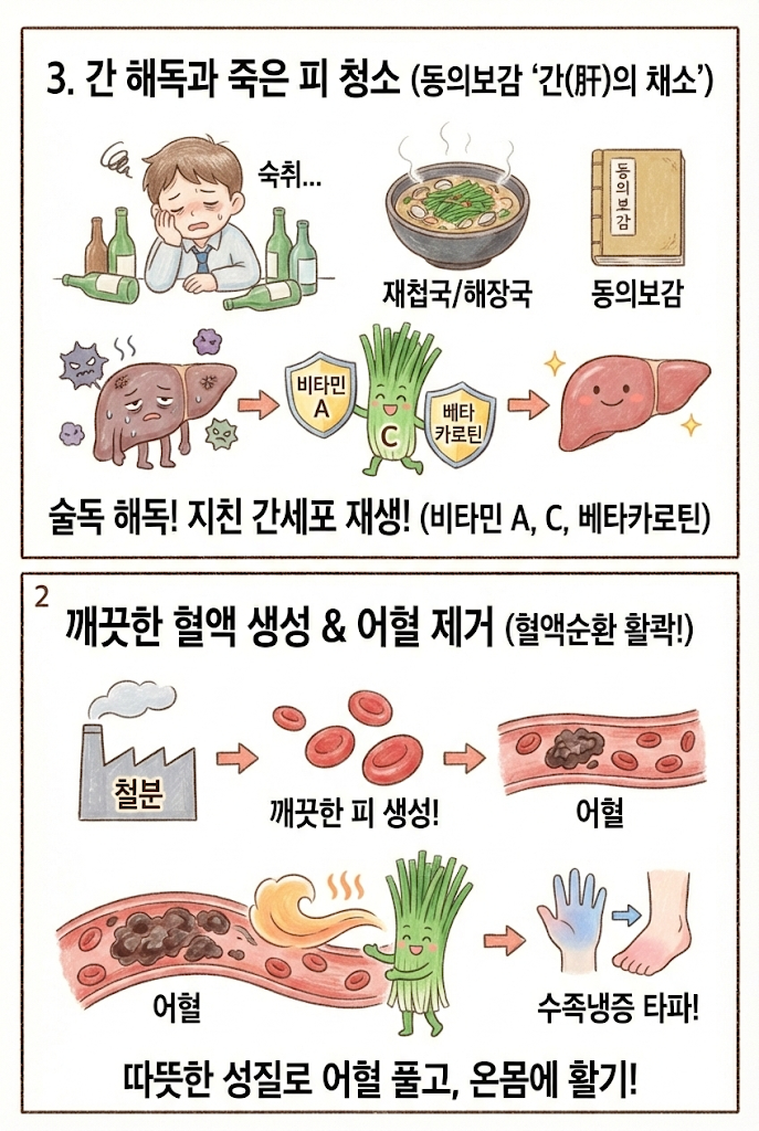 현대인들의 영원한 숙제, '간 건강'과 혈액순환 관리에도 탁월합니다. 술 마신 다음 날 재첩국이나 해장국에 부추를 듬뿍 넣어 먹는 건 다 과학적인 이유가 있었습니다.