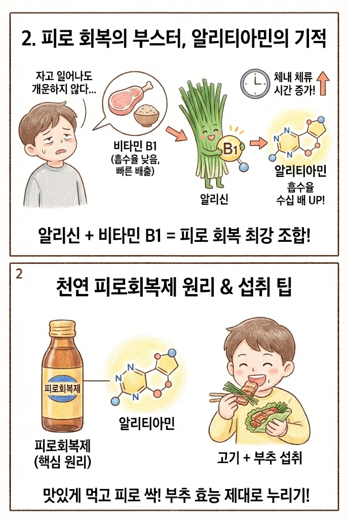 [영양학 연구 결과] 알리티아민은 비타민 B1의 체내 흡수율을 수십 배 이상 높이고, 체내 체류 시간을 획기적으로 늘려줍니다. 유명한 피로회복제 아로나민 시리즈의 핵심 원리가 바로 이것입니다. 즉, 고기 드실 때 부추를 곁들이면 천연 피로회복제를 드시는 것과 같은 부추 효능을 누릴 수 있습니다.