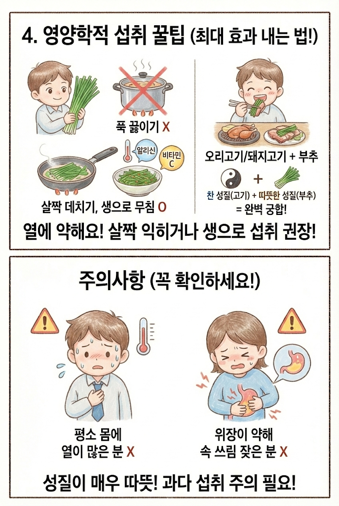 • 살짝만 익혀라 : 알리신과 비타민 C는 열에 약합니다. 푹 끓이기보다는 살짝 데치거나, 생으로 무쳐 먹는 게 부추 효능을 200% 누리는 비결입니다.
