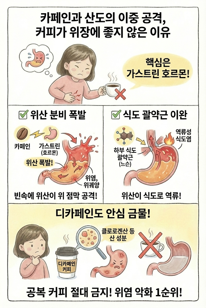 ✅ 위산 분비 폭발 : 커피 속 카페인은 위산 분비를 촉진하는 호르몬인 카스트린의 분비를 즉각적으로 늘립니다. 빈속에 들어온 과도한 위산은 위 점막을 직접 공격하여 위염과 위궤양을 유발합니다.