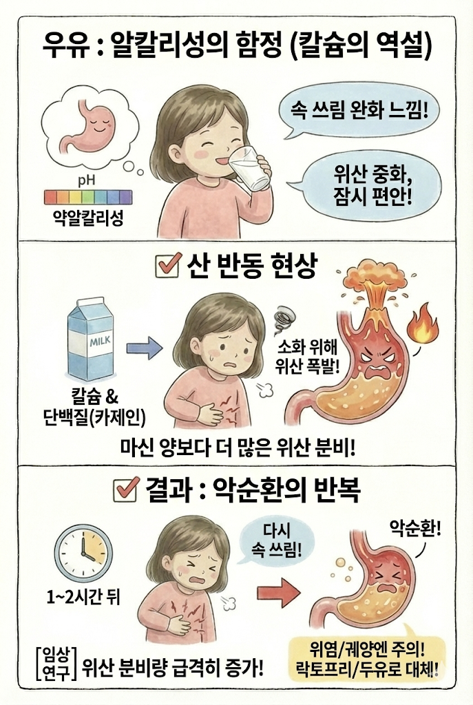 가장 오해하고 많은 식품입니다. 우유는 약알칼리성을 띠고 있어 마시는 직후에는 위산을 중화시켜 속 쓰림이 완화되는 것처럼 느껴집니다. 문제는 그 직후에 발생합니다.