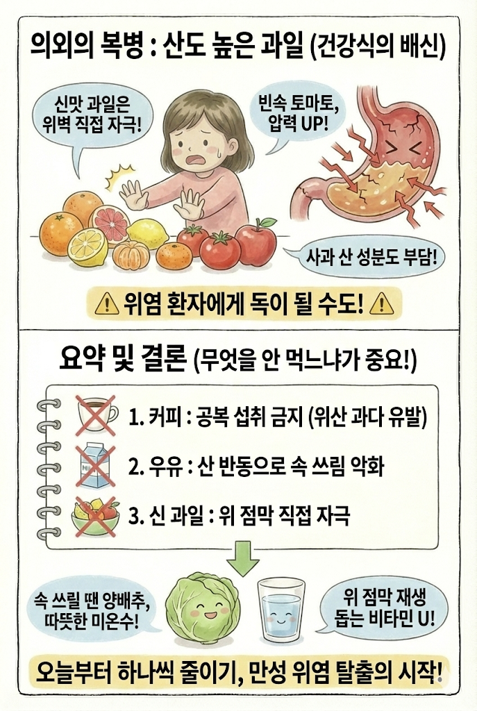 건강식의 대명사인 과일도 위염 환자에게는 독이 될 수 있습니다. 특히 신맛이 강한 감귤류(오렌지, 귤, 자몽, 레몬)는 산도(pH)가 매우 낮아 염증이 있는 위벽을 직접적으로 자극합니다.