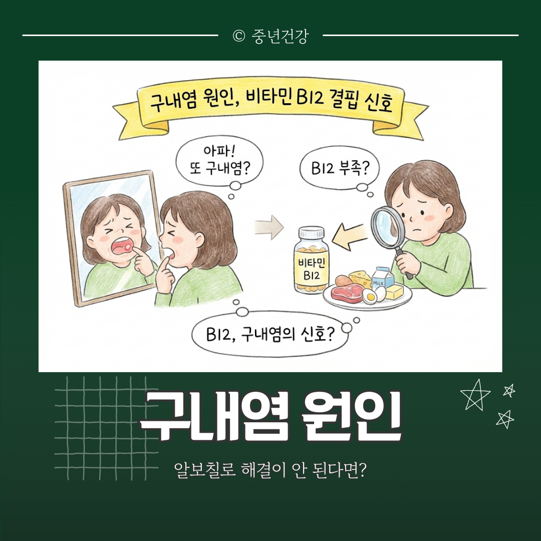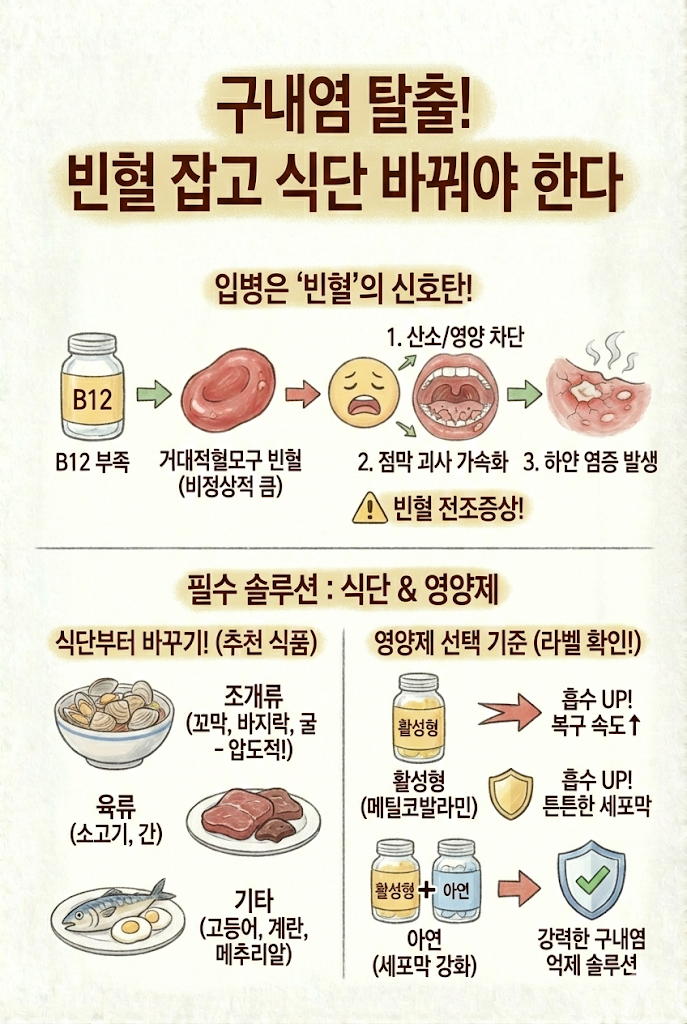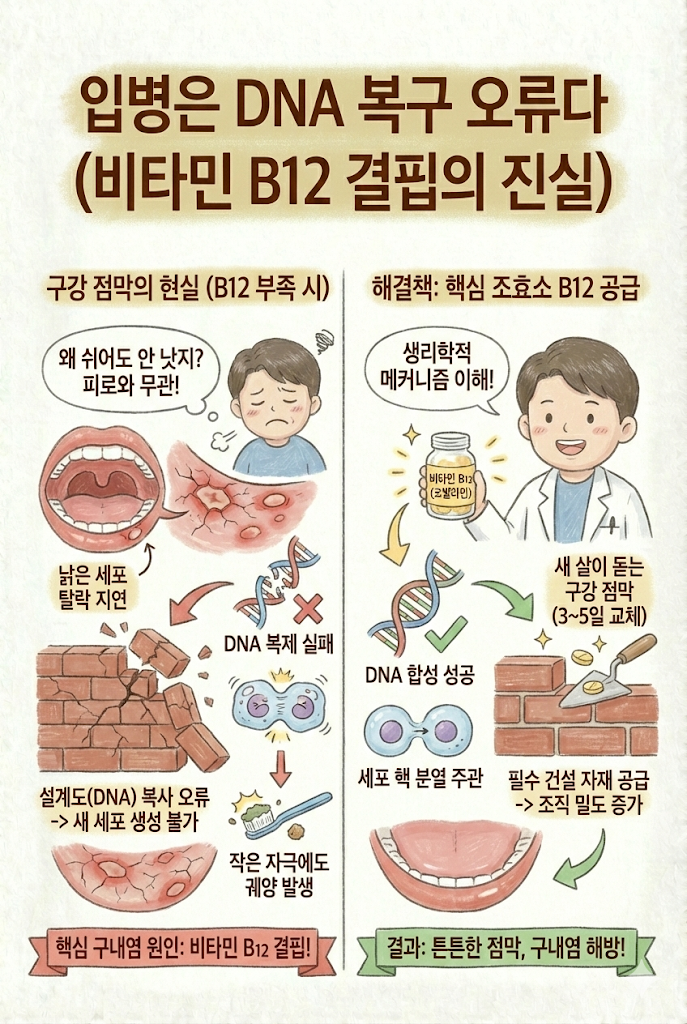 왜 쉬어도 낫지 않을까요? 의학적으로 접근해야 합니다. 만성적으로 반복되는 아프타성 궤양의 핵심 구내염 원인, 바로 비타민 B12(코발라민) 결핍입니다.