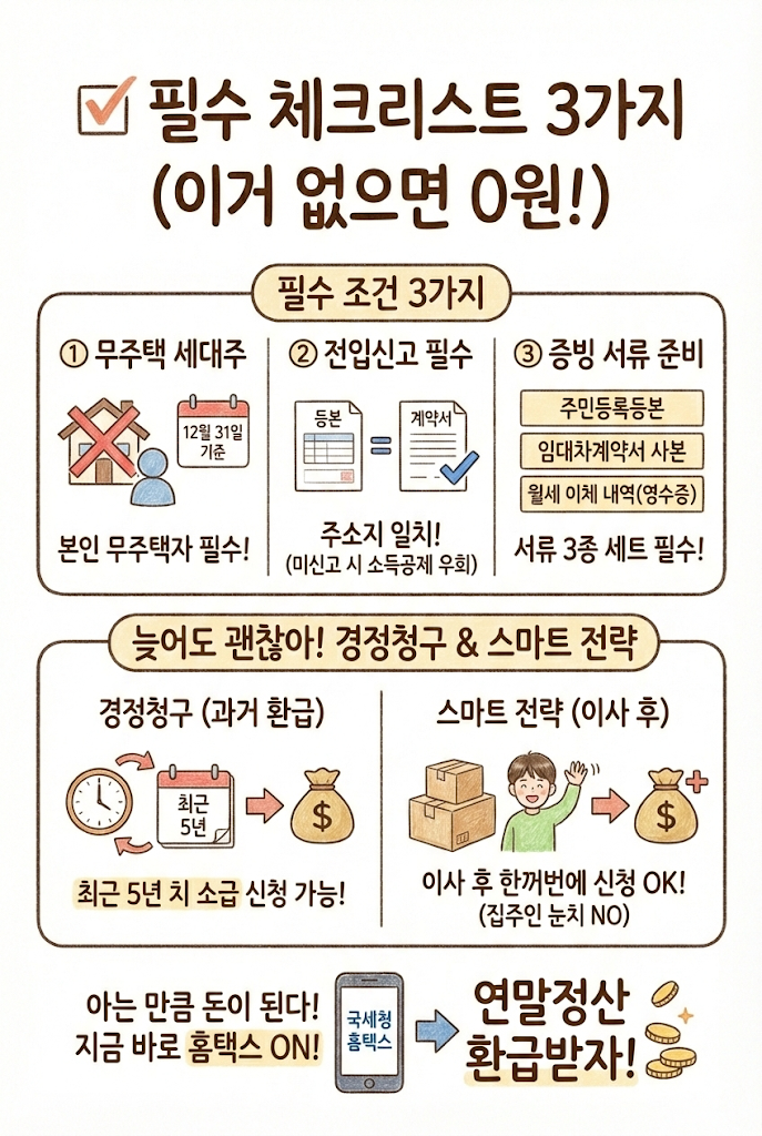 나중에 알고 보니 정말 바보 같은 짓이었어요. 집주인 동의는 애초에 필요 없었고, 심지어 이사 간 뒤에 몰아서 신청해서 돈을 다 돌려받을 수 있었으니까요. 그때 뒤늦게 경정청구로 환급금을 받았던 기억이 납니다. 저처럼 눈치만 보다가 돈 날리지 마시길 바라는 마으로 2026년 핵심 정보를 정리했습니다.