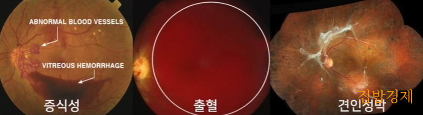 만성적인 산소 부족으로 인해 신생혈관이 발생하고 이런 혈관들은 약해서 잘 터져 유리체 출혈이나 섬유조직이 발생하여 견인성 망막박리로 진행되어 수술을 하게 되거나 치료함에도 실명될 가능성이 있어요